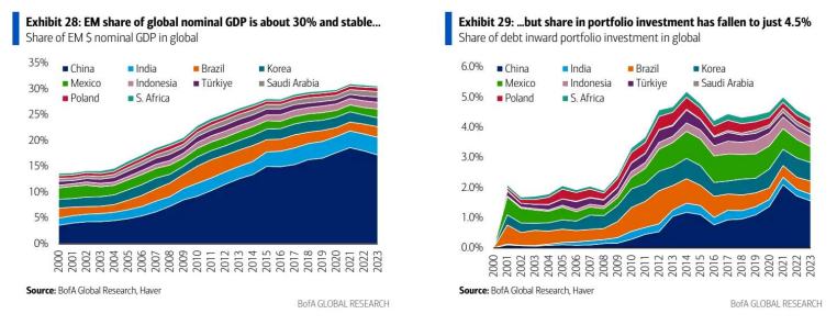 市场对新兴市场的常见质疑是其作为成长型资产但全球增长乏力。但美银认为,投资是相对的博弈,新兴市场增长表现仍优于发达市场(DM)。尽管新兴市场增速较以往放缓,但其规模扩张使其贡献了全球80%的增长。从资产配置角度看,新兴市场占全球名义GDP的30%,但在全球投资组合中的占比不足5%,多元化价值显著。