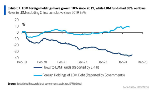 不过,传统基金流入数据未能反映这一趋势,形成“灯下黑”谬误——市场过度关注易于获取的基金流数据,却忽视了更广泛的资金动向。实际上,从更全面的数据来看,新兴市场债务规模已占全球可交易债务的四分之一左右,且外资持有量自2019年以来增长了10%。
