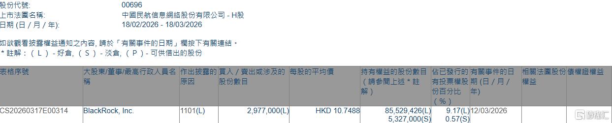 格隆汇3月18日丨根据联交所最新权益披露资料显示,2026年3月12日,中国民航信息网络(00696.HK)获BlackRock, Inc.在场内以每股均价10.7488港元增持好仓297.7万股,涉资约3199.9万港元。