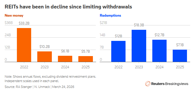 市场不乏令人安心的先例。在私募信贷热潮兴起前,非上市房地产投资信托基金(REIT)曾是零售投资者的热门选择。与BDC类似,这类产品同样具备“半流动性”,仅提供有限的常规赎回通道,而黑石旗下BREIT产品正是其中代表。2022年加息周期引发市场对地产价值的普遍悲观,相关产品遭遇大规模赎回,最终纷纷启动赎回限制。好消息是,多数基金最终挺过了危机;坏消息则是,全行业资金流入大幅崩盘,据RA Stanger统计,非上市REITs股权规模在此期间缩水近四分之一。