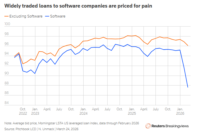 长期来看,仍有诸多因素可能令投资者却步。越来越多的借款人出现逾期或违反契约条款。追踪私营企业信用状况的惠誉评级数据显示,2月违约率为5.4%,虽较1月小幅回落,但仍高于近年水平。若中东地区冲突引发能源冲击、人工智能(AI)带来的行业冲击持续加剧,信贷损失可能进一步扩大。RA Stanger研究估算,BDC基金平均有25%的资金投向受AI高风险冲击的企业,同时不同基金之间差异极大,敞口区间在9%至41%之间。公开市场定价已预示损失不可避免:据PitchBook LCD数据,今年以来,流通广泛的软件企业贷款价格已从面值的95%跌至87%。