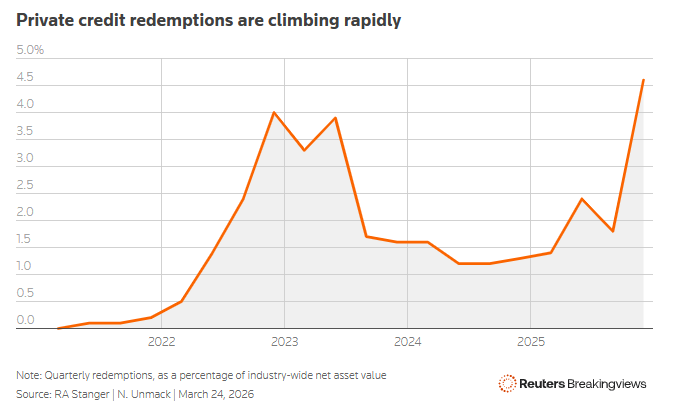 但如今,这台“赚钱机器”开始出现故障。以亚洲零售账户为首,高净值投资者持续加大资金撤出力度。行业普遍设有赎回上限,定期要约回购设有硬性最高额度,常规限制通常为每季度不超过资产规模的5%。而RA Stanger数据显示,不计新增资金流入,2025年全年行业赎回规模持续攀升,四季度已触及行业净资产的4.6%峰值,2026年这一趋势仍在加速。