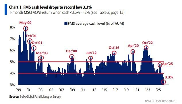 据美国银行(Bank of America)最新的基金经理调查显示,基金经理们的现金水平已大幅降至资产管理规模的3.3%,创下历史新低。与此同时,投资者对经济增长、股票和大宗商品的信心爆棚,这两类通常在经济扩张期表现良好的资产,其合计敞口已达到2022年2月以来的最高水平。