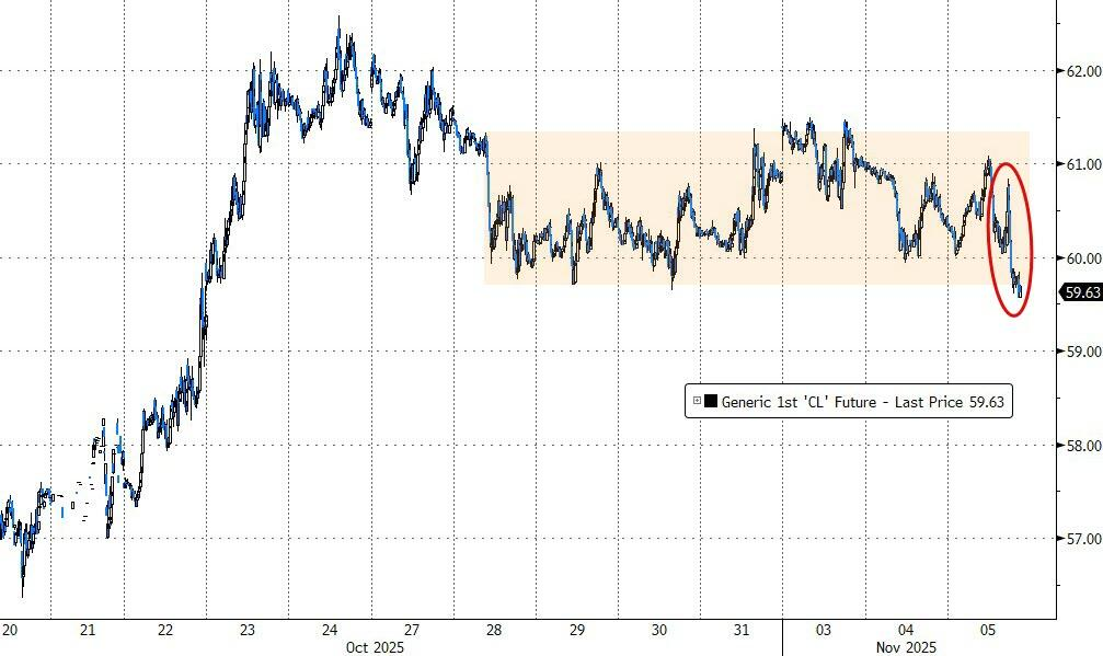 WTI 12月原油期货收跌0.96美元,跌幅1.59%,报59.60美元/桶,逼近10月22日收盘位58.50美元。