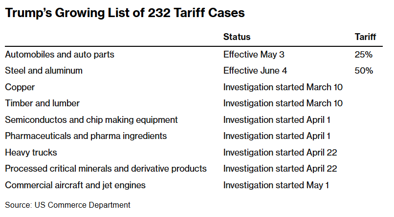 特朗普不断扩大的232关税案件清单如上,众多行业的特定关税调查未出炉