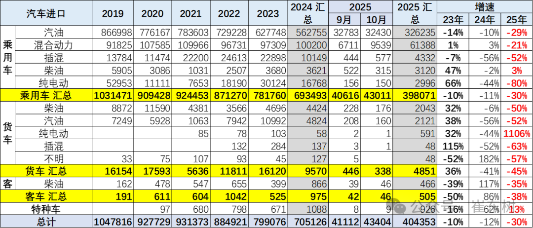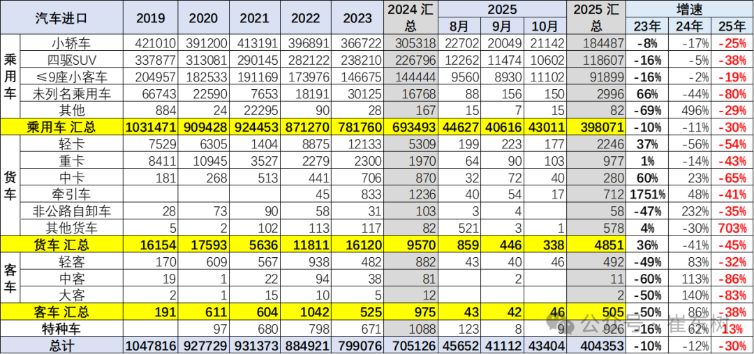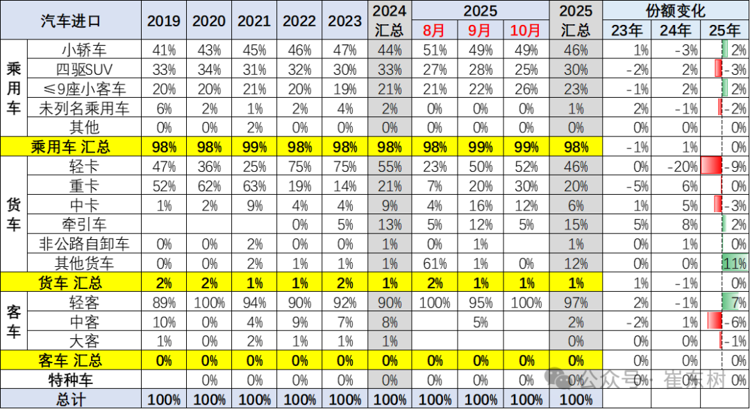 2019年以来各类进口车型全面下滑。传统的卡车2023年进口较多,目前快速回落明显。2025年1-10月乘用车的进口小于需求,进口未来增长较难。