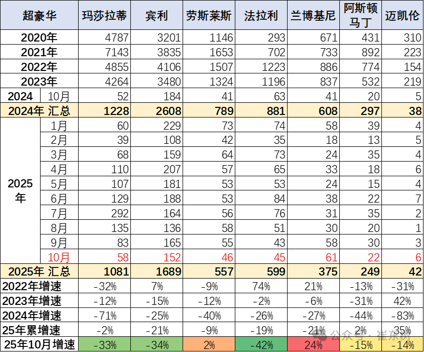 过去几年进口超豪华车持续增长,但2023年以来出现较大的下滑,2024年加速下滑,2025年1-10月下滑仍较严峻。玛莎拉蒂的走势总体改善。劳斯莱斯表现较坚挺,今年恢复增长,但仍在相对高位销量。法拉利的走势低迷。超豪华总体走弱,体现超高端消费群体的购买力暂时放缓,但高端跑车2025年1-10月表现很不错。