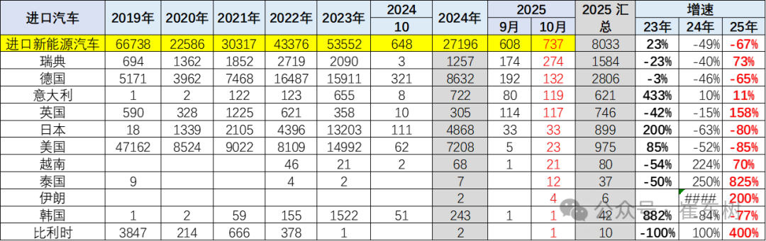 10月进口车下滑压力仍较大。2025年10月进口最高的前10国家是:日本23935辆、德国8076辆、英国3984辆、斯洛伐克3191辆、瑞典2072辆、美国729辆、墨西哥448辆、韩国177辆、意大利159辆、匈牙利153辆。其中本期较同期增量增大的前五个是:日本8249辆、瑞典624辆、泰国71辆、印度54辆、意大利53辆。