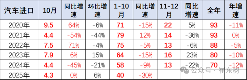 2025年1-10月进口汽车40万辆,同比下降30%,这是近期少见的1-10月巨大下滑。其中10月进口车4.3万台,同比下滑0.5%,环比9月增6%。2024年汽车进口70万辆,同比下降12%。随着国产车的崛起和国际品牌本土化加速,近几年汽车进口持续低迷,进口车持续3年负增长,如果熨平波动,则是连续7年的负增长。