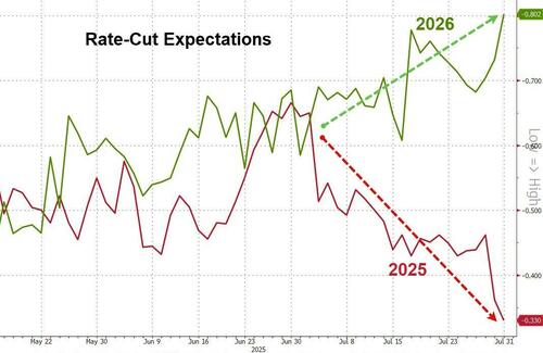 强劲的宏观数据以及鲍威尔本周明显鹰派的表态,已导致利率市场对美联储年内降息幅度的预期大幅回落——现在预计年内降息两次的概率已低于了五成,而对2026年降息幅度的预期则攀升。