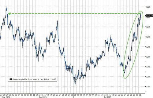 这帮助美元在7月份上涨了逾2.5%——这也是自去年12月份以来彭博美元指数首次在月线走高。