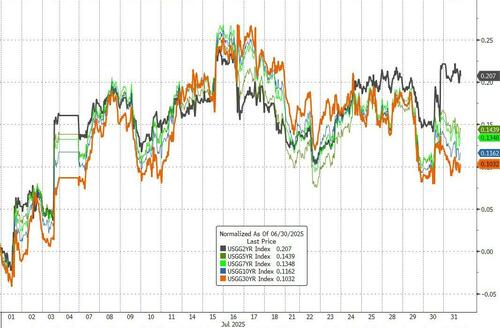 在美债市场上,7月份,美债收益率全面走高。其中,与美联储利率预期变动关联最为紧密的2年期美债收益率升幅最大。