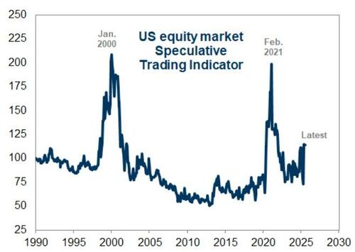 高盛编制的投机交易指标(STI))大幅上涨,目前已处于了1998-2001年和2020-2021年以外的最高水平(尽管眼下仍远低于这两个时期达到的高点。