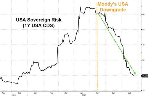 在二季度美国资产一度遭遇“股债汇”三杀后,围绕“美国例外论”的交易似乎又开始卷土重来。7月,衡量美国主权信用风险的指标——美国1年期信用违约掉期(CDS)继续下降,现已回落到了去年大选时的低位水平……