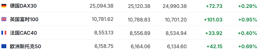 2. 截至发稿,德国DAX指数涨0.29%,英国富时100指数涨0.95%,法国CAC40指数涨0.40%,欧洲斯托克50指数涨0.69%。
