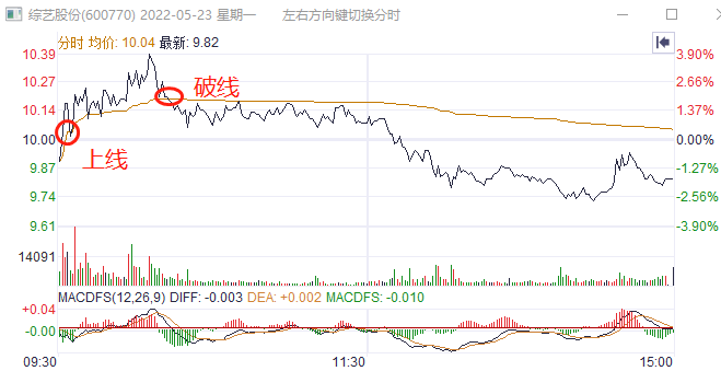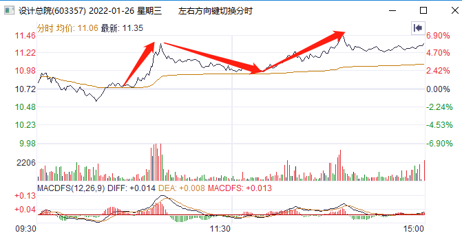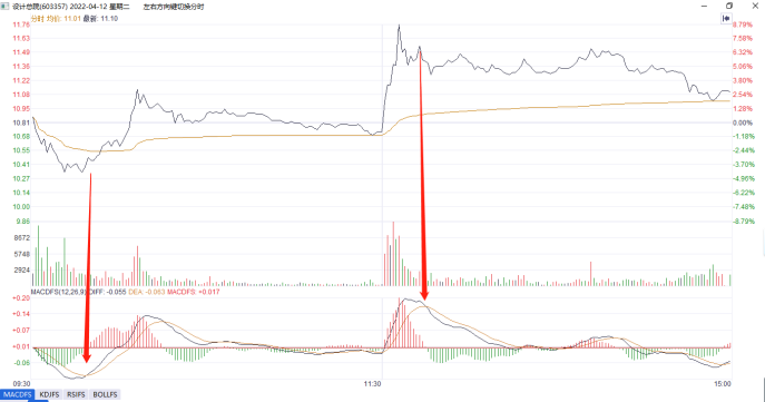 来看这个区域,股价分时持续走高,但是看MACD指标,持续走弱,这就是顶部背离,后期往往会打一下。