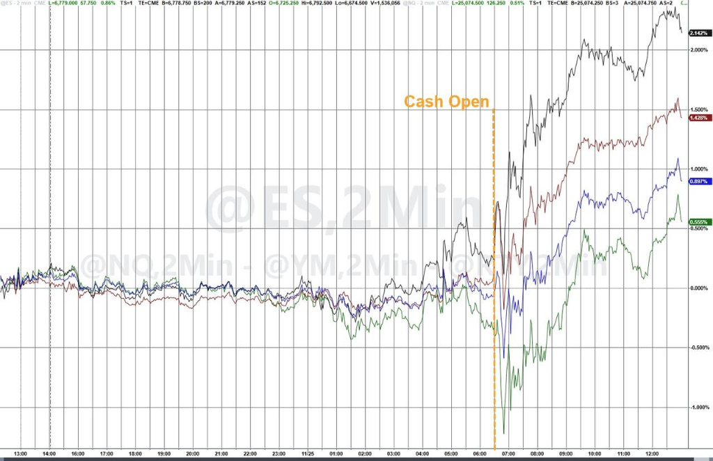 - 美股尾盘,在疲软经济数据、鸽派美联储主席人选以及和平谈判进展的多重“利好”下,美股全线收高。道指大涨1.43%,罗素小盘股指更是飙升2.14%。尽管早盘一度领跌,但科技股最终也成功翻红。