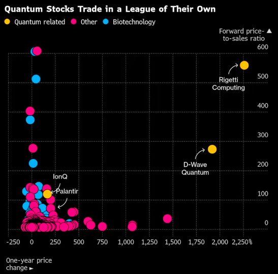 以Rigetti为例。这家总部位于加州伯克利的公司预计未来四个季度仅将产生约2000万美元收入,主要来自开发合同和量子处理器销售。按当前股价计算,其市销率指标(估值/预期销售额)已达500多倍。相比之下,Palantir的远期市销率为72倍,纳斯达克100指数成分股的市销率不足6倍。