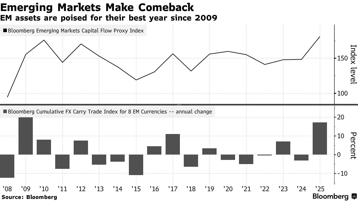 智通财经APP获悉,新兴市场有望在2026年伊始成为华尔街的宠儿,资产管理机构正押注一轮持续多年的资金流入周期已经启动。今年涌入该领域的资本规模——覆盖所有新兴市场证券,创下自2009年以来的最佳表现——表明,越来越多的投资者正在重新配置这一此前多年表现乏力、长期不受青睐的资产类别。自2017年以来,新兴市场股票首次跑赢美国股票,新兴市场债券收益率与美国国债之间的利差收窄至11年来最低水平,而套利交易策略——通常是借入低收益资产、买入高收益资产——也取得了自2009年以来的最佳回报。