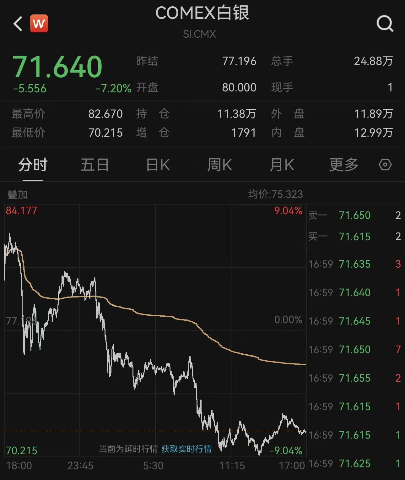 作为日内全球市场的焦点,这一轮金属上涨狂潮的“带头大哥”白银日内巨震,Comex白银期货创出每盎司82美元新高后跳水至71.6美元,黄金、铂金、钯金等品种也携手下挫。矿业板块集体下跌,First Majestic Silver跌4.13%、纽曼矿业跌5.64%,锂矿巨头美国雅宝也跌3.62%。