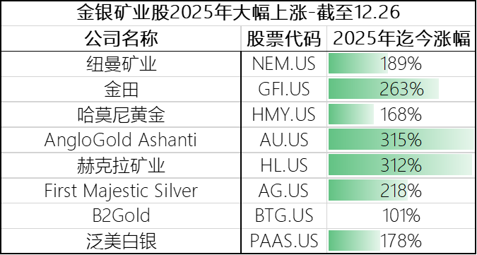 此外,贵金属在2025年惊艳的表现也带动了金银矿业股的上涨。数据显示,2025年迄今,黄金现货价格累计上涨超71%,白银现货涨幅更甚——超143%,是黄金涨幅的近两倍。得益于此,包括纽曼矿业(NEM.US)、金田(GFI.US)在内的一众金银矿业股都实现了大幅上涨。