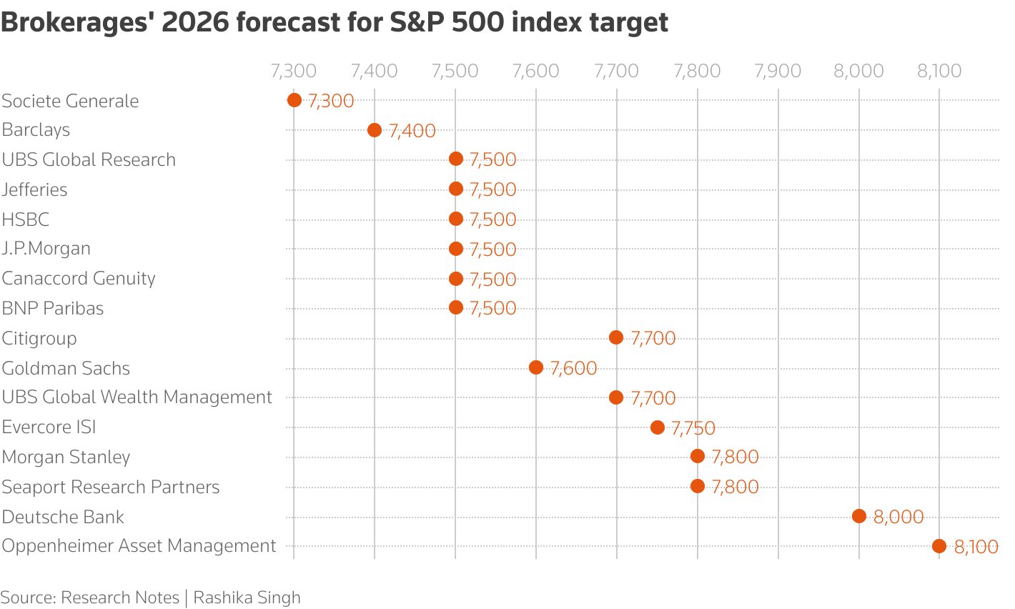 投行Oppenheimer给出了给出华尔街最乐观预测,称随着每股收益持续保持两位数增长,标普500指数将在2026年底升至8100点。德银设定了2026年底8000点的标普500目标位,该行的信心源于其对盈利增长“扩散”的预期。摩根士丹利同样立场乐观,预计标普500指数将在未来一年攀升至7800点。花旗基于企业盈利增长拓宽、AI主题深化等核心逻辑,设定标普500指数2026年末基准目标位7700点。摩根大通股票策略团队为标普500指数设定了2026年年末7500点的目标位,同时指出,若美联储持续实施降息政策,这一基准指数在未来一年有望突破8000点。瑞银全球研究称,美股由AI推动的上涨行情将延续至2026年,因此将标普500指数明年年底目标设定为7500点。汇丰同样将2026年底标普500指数目标点位设定为7500点。巴克莱对2026年底标普500指数的目标为7400点,并表示尽管宏观经济增长乏力,但大型科技股表现强劲,并且货币与财政环境正在持续改善。