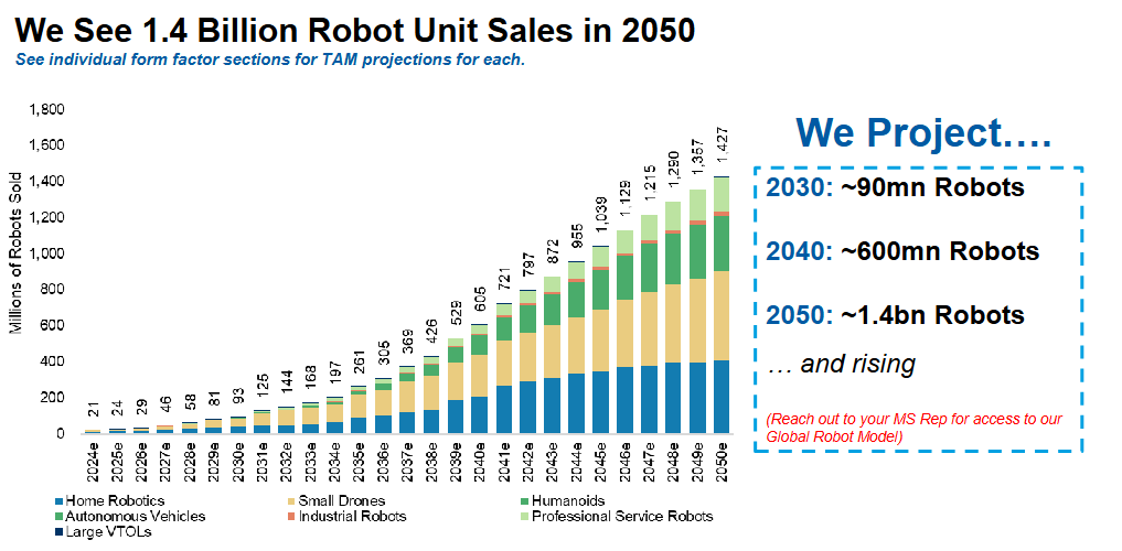 大摩通过其全球机器人模型(GROM)预测,到2050年全球将销售14亿台机器人,运行中的机器人总数将达到65亿台。