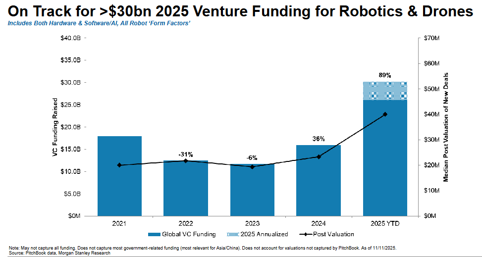 在这方面,中国展现出明显优势。据大摩统计,2025年机器人和无人机领域的风险投资有望超过300亿美元,AI相关企业融资总额将达到2600亿美元,中国企业在其中占据重要地位。在人形机器人开发商名单中,中国公司数量众多,包括优必选、小鹏机器人、乐聚机器人等。
