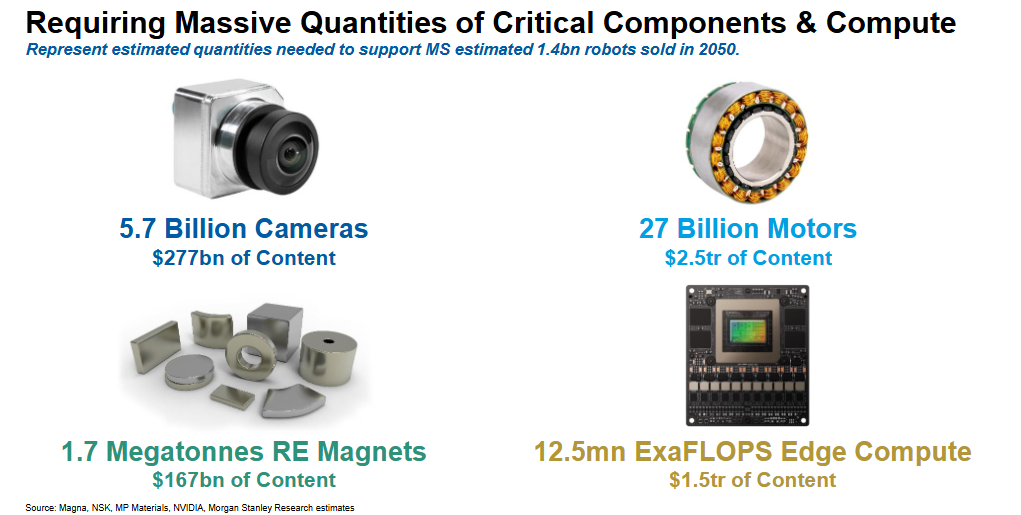 大摩预计,到2050年支撑14亿台机器人销售将需要:57亿个摄像头(较2025年增长95倍)、270亿个电机(增长260倍)、410亿个轴承(增长200倍)、1250万ExaFLOPS边缘计算能力(增长4万倍)、170万吨稀土磁铁(增长480倍)以及26太瓦时电池容量(增长1450倍)。