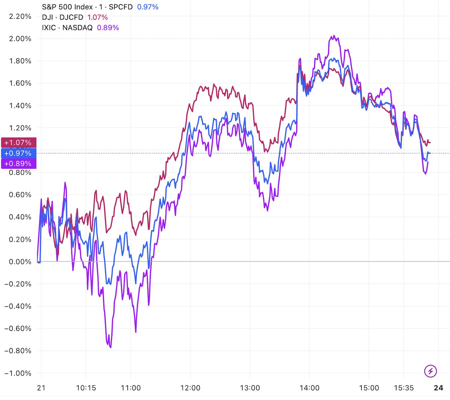 截至收盘,道琼斯指数涨1.08%,报46,245.41点;标普500指数涨0.98%,报6,602.99点;纳斯达克指数涨0.88%,报22,273.08点。