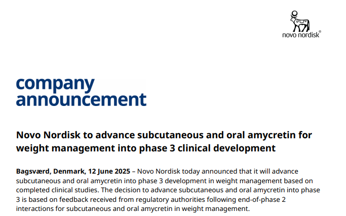 当地时间周四(6月12日),丹麦生物制药巨头诺和诺德在官网宣布,公司将推进其体重管理药物“Amycretin”的Ⅲ期临床试验。