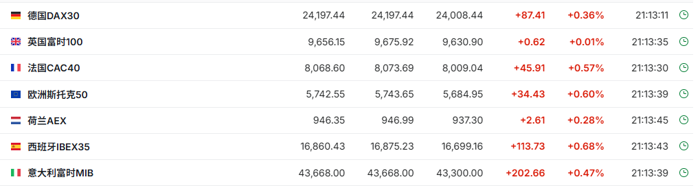 正在交易的欧洲股市多数走高,德国DAX指数现涨0.36%,英国富时100指数涨0.01%,法国CAC40指数涨0.57%。