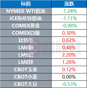 COMEX黄金期货收跌0.08%,报3431.8美元/盎司。COMEX白银期货收涨0.3%,报37.935美元/盎司。WTI原油期货收跌1.24%,报64.35美元/桶。布伦特原油期货收跌1.11%,报66.89美元/桶。