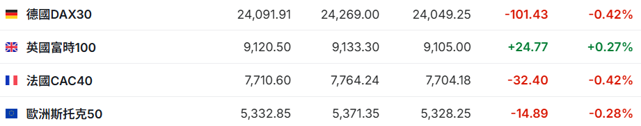 2. 截至发稿,德国DAX指数跌0.42%,英国富时100指数涨0.27%,法国CAC40指数跌0.42%,欧洲斯托克50指数跌0.28%。