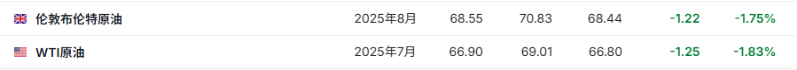 3. 截至发稿,WTI原油跌1.83%,报66.90美元/桶。布伦特原油跌1.75%,报68.55美元/桶。