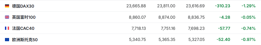 2. 截至发稿,德国DAX指数跌1.29%,英国富时100指数跌0.05%,法国CAC40指数跌0.74%,欧洲斯托克50指数跌0.97%。