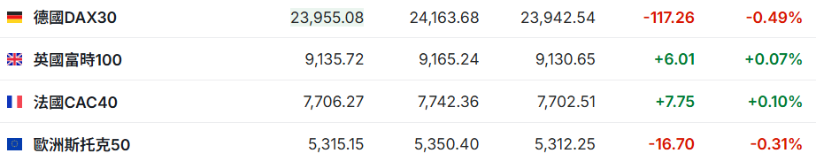 2. 截至发稿,德国DAX指数跌0.49%,英国富时100指数涨0.07%,法国CAC40指数涨0.10%,欧洲斯托克50指数跌0.31%。