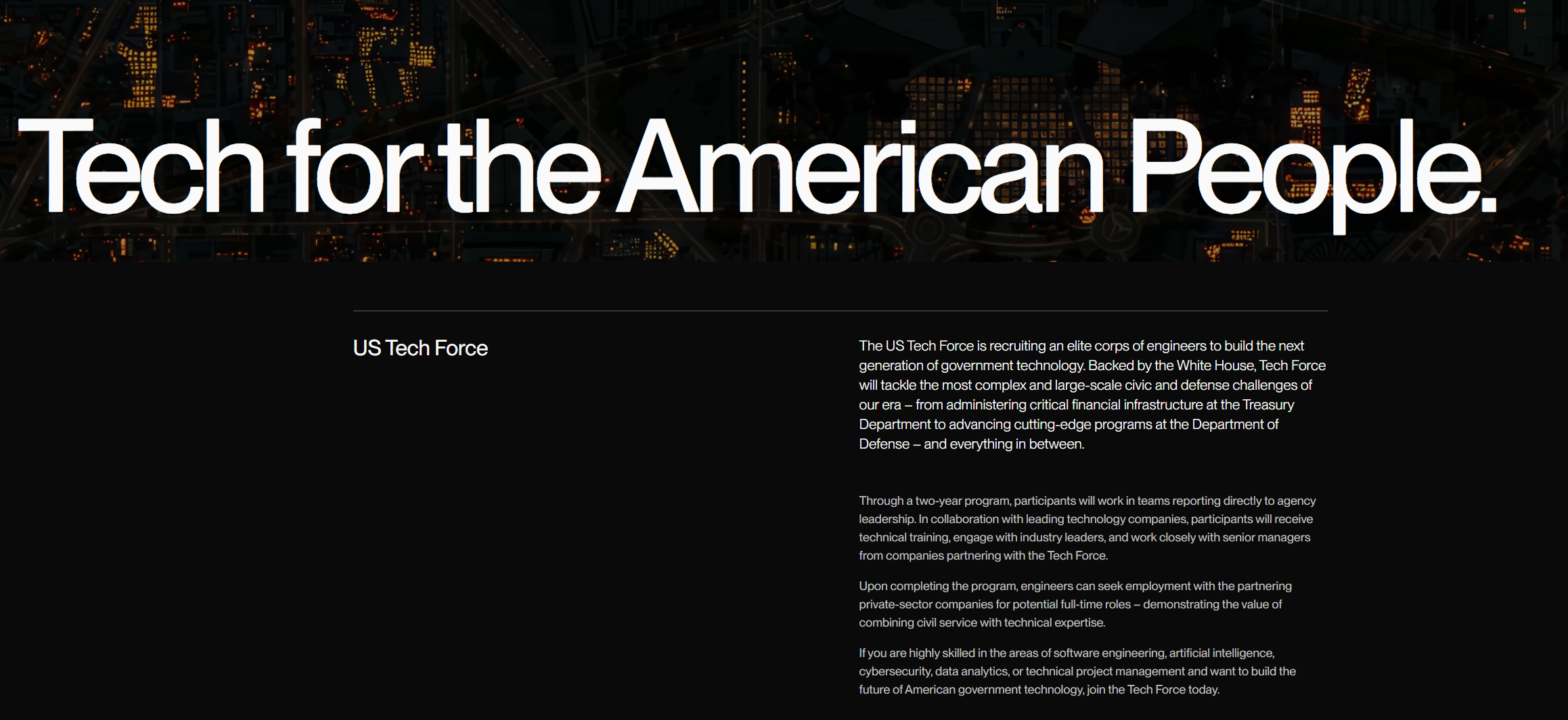 美国技术部队正在招募一支精英工程师队伍,以打造下一代政府技术。在白宫的支持下,技术部队将应对我们这个时代最复杂、规模最大的民用和国防挑战——从管理财政部的关键金融基础设施到推进国防部的尖端项目——以及介于两者之间的所有领域。