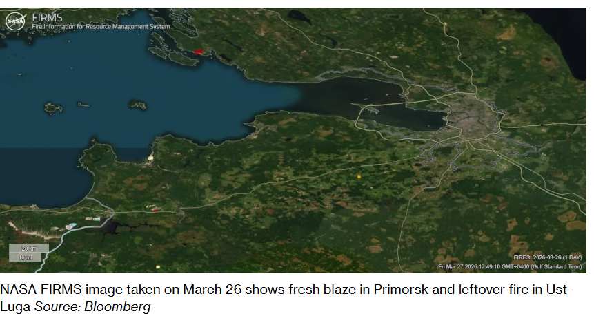 此前一组来自3月26日的美国国家航空航天局FIRMS图像数据显示,普里莫尔斯克出现了新的火情,而乌斯季卢加则仍有残余火点,这可能是周三那场无人机袭击造成的结果。