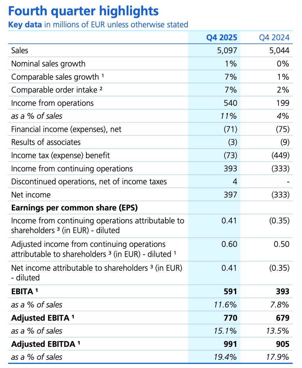 盈利方面,Q4调整后的息税摊销前利润(EBITA)为7.70亿欧元,好于分析师共识预期的6.72亿欧元;调整后的EBITA利润率为15.1%,较上年同期增加160个基点。这主要得益于销售额增长、产品结构优化效应以及生产效率提升措施,尽管部分利润被关税成本上升所抵消。净利润为3.97亿欧元,上年同期净亏损3.33亿欧元。