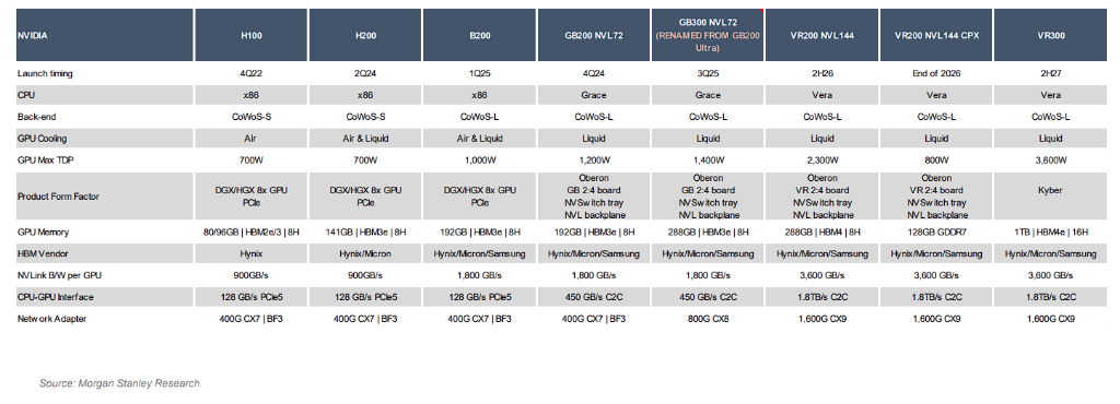 大摩在报告中明确指出,AI硬件的增长动力正从H100/H200时代,转向由NVIDIA的GB200/300(Blackwell平台)及后续的Vera Rubin(VR系列)平台所驱动的新周期。