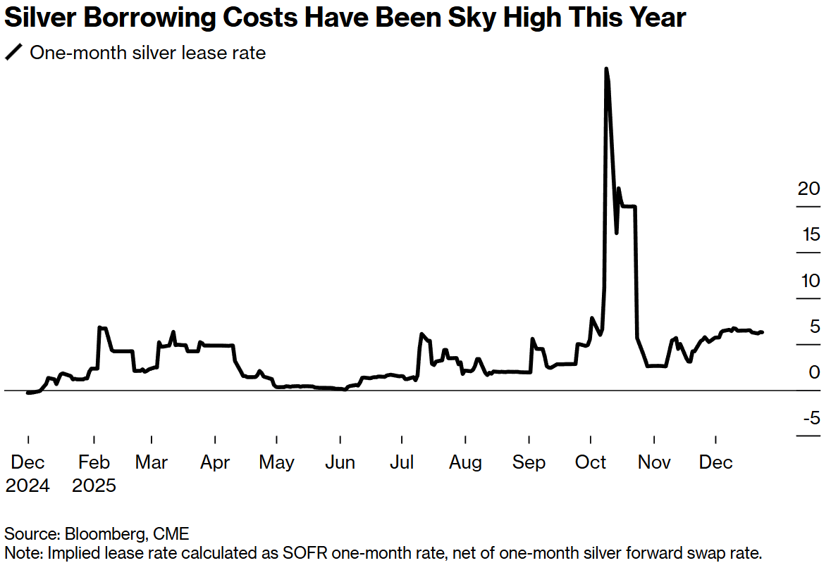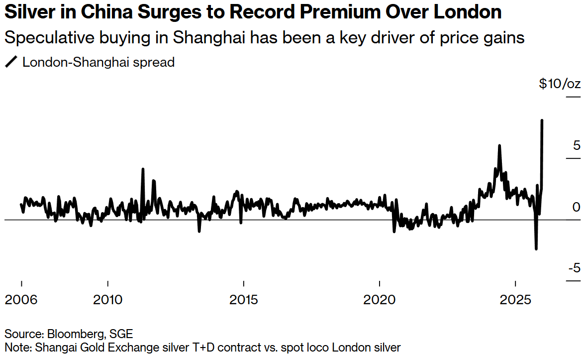 中国投资者激增的兴趣是近期银价上涨的主要驱动力。投机者蜂拥而入购买这种贵金属,这与铂金市场的动态如出一辙。12 月份,上海黄金交易所白银合约的购买量攀升,将溢价推至历史新高,并带动了其他国际基准价格。