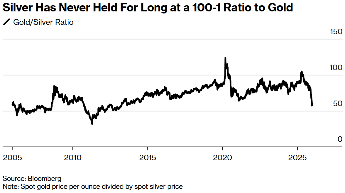 许多投资者还追踪这两种大宗商品之间的比价。在今年年初黄金初步飙升后,金银比扩大到 100:1 以上,向一些人发出了买入白银的信号。但在最近几周,这一比率已迅速走低。