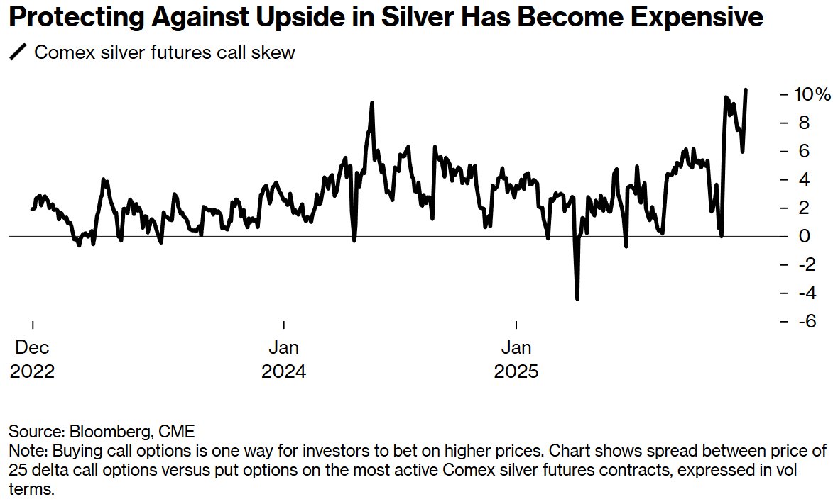 对于最大的白银 ETF——iShares Silver Trust (SLV) 而言,其总的看涨期权未平仓合约本周达到了 2021 年以来的最高水平。相对于预防价格下跌的看跌期权,购买白银期货看涨期权的成本在最近几周也跳升至历史高位。