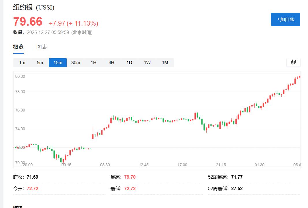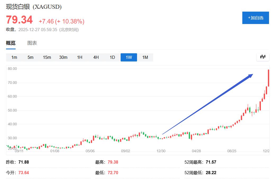 受益于地缘政治紧张局势加剧、美元走软以及圣诞节次日市场流动性不足,本周五金银齐创历史新高,白银首次逼近80美元/盎司,迅猛涨势远超黄金。