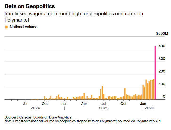 如上图所示的那样,地缘政治相关的真实押注合约——与美国、以色列以及伊朗相关的真金白银赌注资金推动Polymarket上的地缘政治合约升至纪录高位。