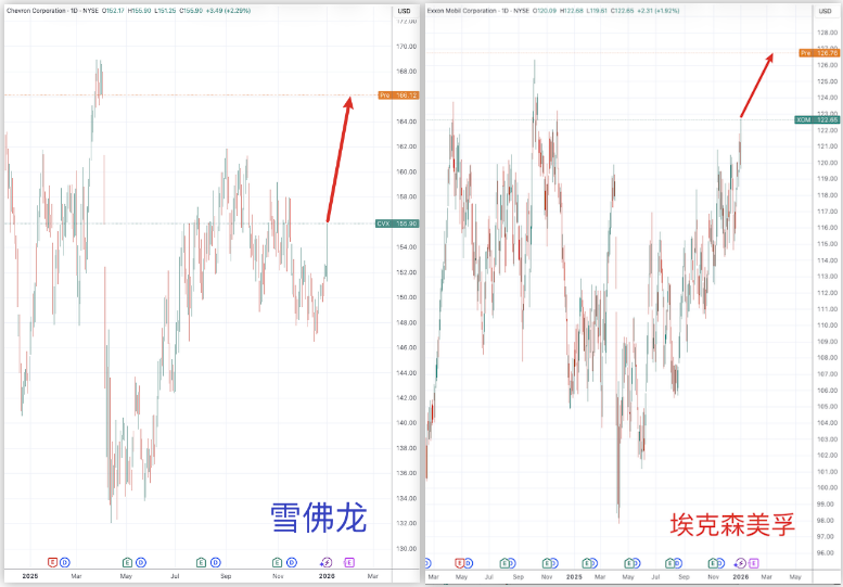 截至北京时间晚20点,美国两大石油巨头雪佛龙、埃克森美孚盘前交易时段分别上涨7.12%和3.87%,后者有望在开盘后再创历史新高。美国第三大石油公司康菲石油涨超6%,全球最大油田技术服务公司斯伦贝谢也涨近9%。