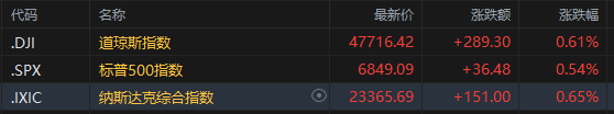 截至收盘,道琼斯指数涨0.61%,报47716.42点;标普500指数涨0.54%,报6849.09点;纳斯达克综合指数涨0.65%,报23365.69点。