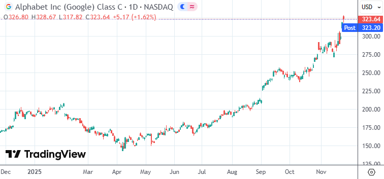 谷歌A涨1.53%,谷歌C涨1.62%,均收于新高,市值达3.9万亿美元,逼近4万亿关口。