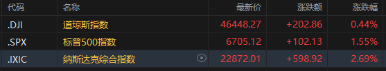截至收盘,纳斯达克综合指数涨2.69%,报22872.01点,录得5月以来的最大单日涨幅;道琼斯指数涨0.44%,报46448.27点;标普500指数涨1.55%,报6705.12点。